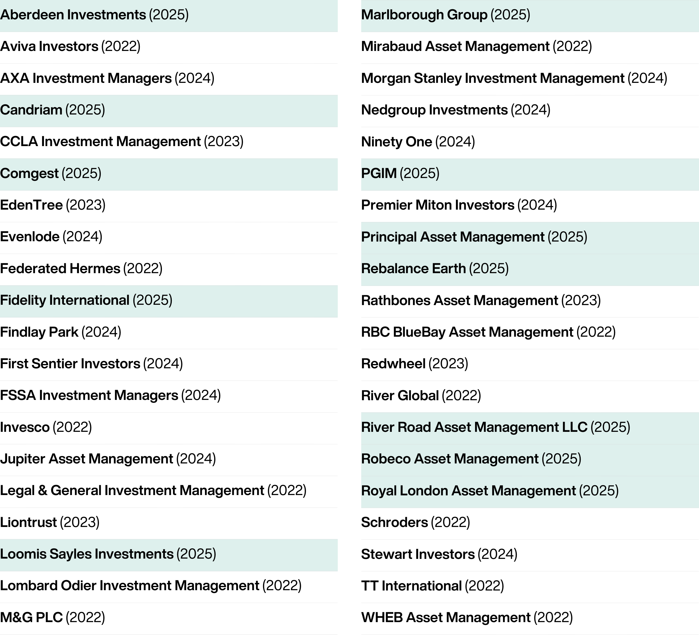 Twelve new names have joined in the last year, with six asset managers joining since the publication of the mid-year ACT 2025 list in July 2025: Aberdeen Investments, Candriam, Comgest, Loomis Sayles, River Road and Royal London Asset Management.